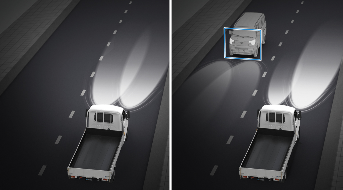車輛行駛速度達30km/h以上,系統將根據環境狀況自動切換燈光,昏暗時切換遠光燈,加強照明;若對向有來車,則切換為近光燈,避免影響對向來車。